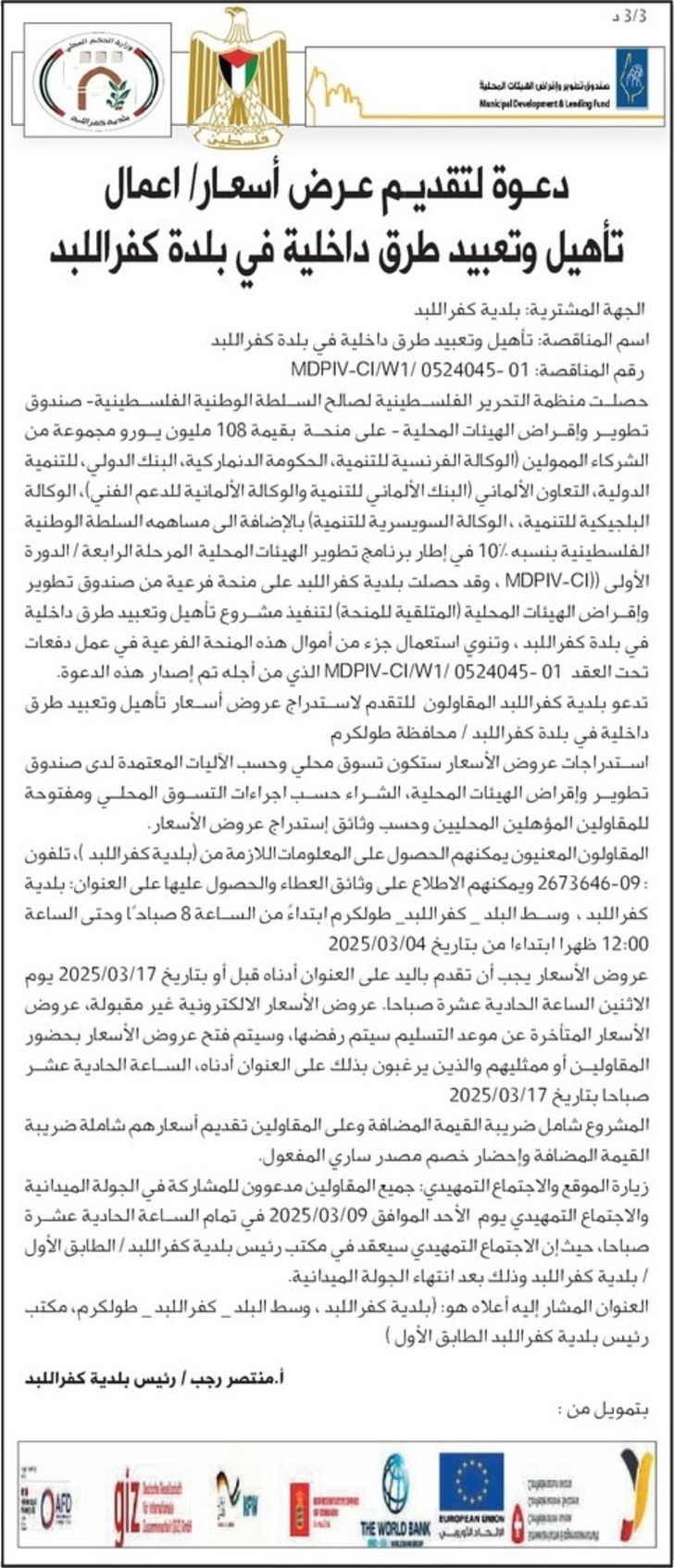 تحت العقد 01 - MDPIV - CI / W1 / 0524045 الذي من أجله تم إصدار هذه الدعوة . تدعو بلدية كفر اللبد المقاولون للتقدم لاستدراج عروض أسعار تأهيل وتعبيد طرق داخلية في بلدة كفر اللبد / محافظة طولكرم استدراجات عروض الأسعار ستكون تسوق محلي وحسب الآليات المعتمدة لدى صندوق تطوير وإقراض الهيئات المحلية الشراء حسب اجراءات التسوق المحلي ومفتوحة للمقاولين المؤهلين المحليين وحسب وثائق إستدراج عروض الأسعار .